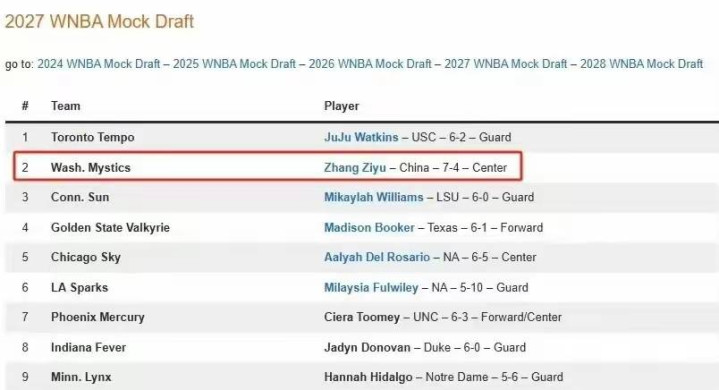 美国选秀网站最新榜单犹如一颗深水炸弹——18岁的张子宇在2027年WNBA模拟选秀中飙升至榜眼位置,仅次于南加州大学王牌朱朱·沃特金斯。短短一个月,这位中国女篮新星从第四跃居第二,背后是她四场热身赛场均13分钟狂揽17分7篮板、73.8%命中率的恐怖效率。当美国球迷惊呼她是“女篮奥尼尔”时,国内篮球圈却陷入激烈争论:这颗冉冉升起的新星,究竟该不该远渡重洋?